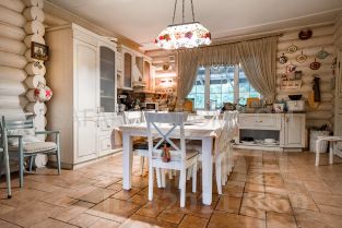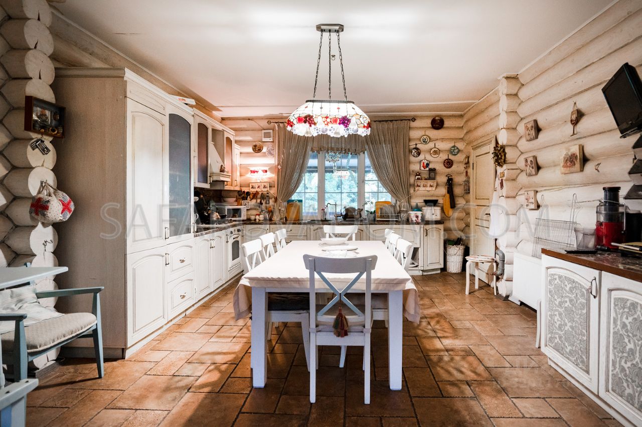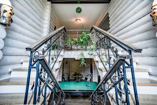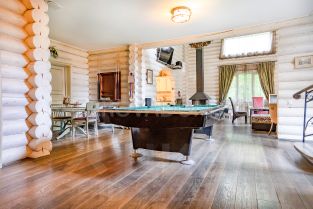 На первом этаже находится гостиная с камином, кухня-столовая полностью оборудованная техникой и посудой, бильярд, телевизор, караоке система, санузел, одна спальня.
