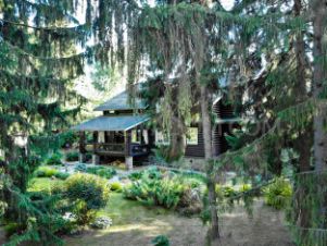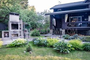 На участке: деревянная беседка, сосны, баня, мангал, барбекю, ландшафтный дизайн.