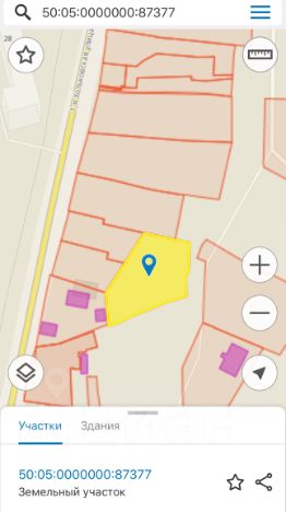 Участок с межеванием (его кадастровый номер 50:05:0000000:87377), для ИЖС. На участке береза, две ели и старый сарай.
